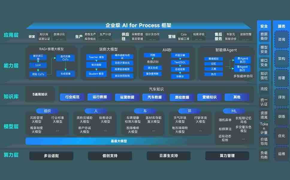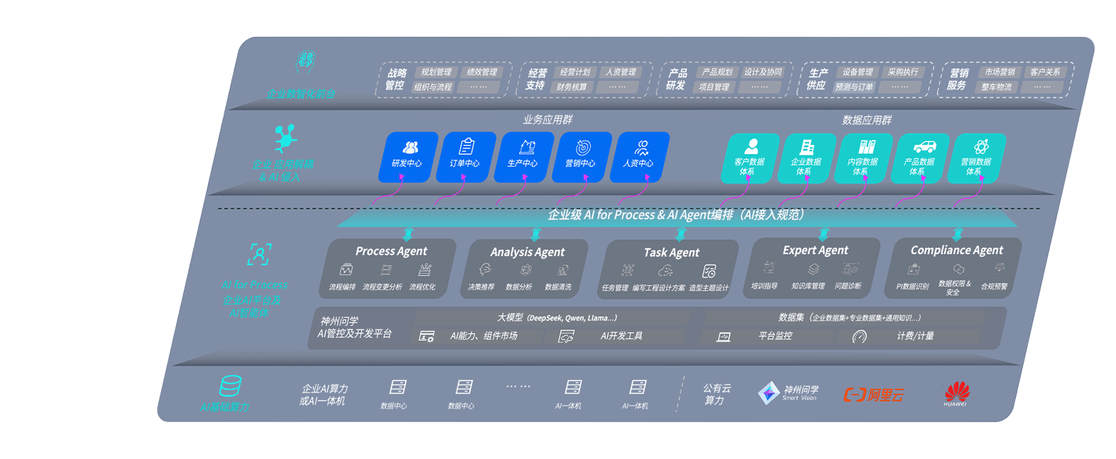 意昂2问学智车解决方案是一套基于AI技术的汽车行业智能化系统,,覆盖从底层算力到顶层AI应用的全栈方案。。方案由算力层、、、模型层和应用层组成:算力层,,,,方案支持多种一体机配置,,具备云端灵活部署、、、多云适配以及动态优化计算资源的能力;模型层,,,,意昂2问学平台版提供了企业级AI应用一站式构建与管理平台,,,支持基于后训练强化技术的汽车企业专属模型的训练、、、评测和运营;应用层,,意昂2问学DeepSeek版提供包括超级员工、、、、智能招采、、、智能营销、、、智能客服、、、AI for BI等一系列解决方案,,可助力汽车行业实现数字化转型,,,,让管理更智能、、响应更敏捷。。