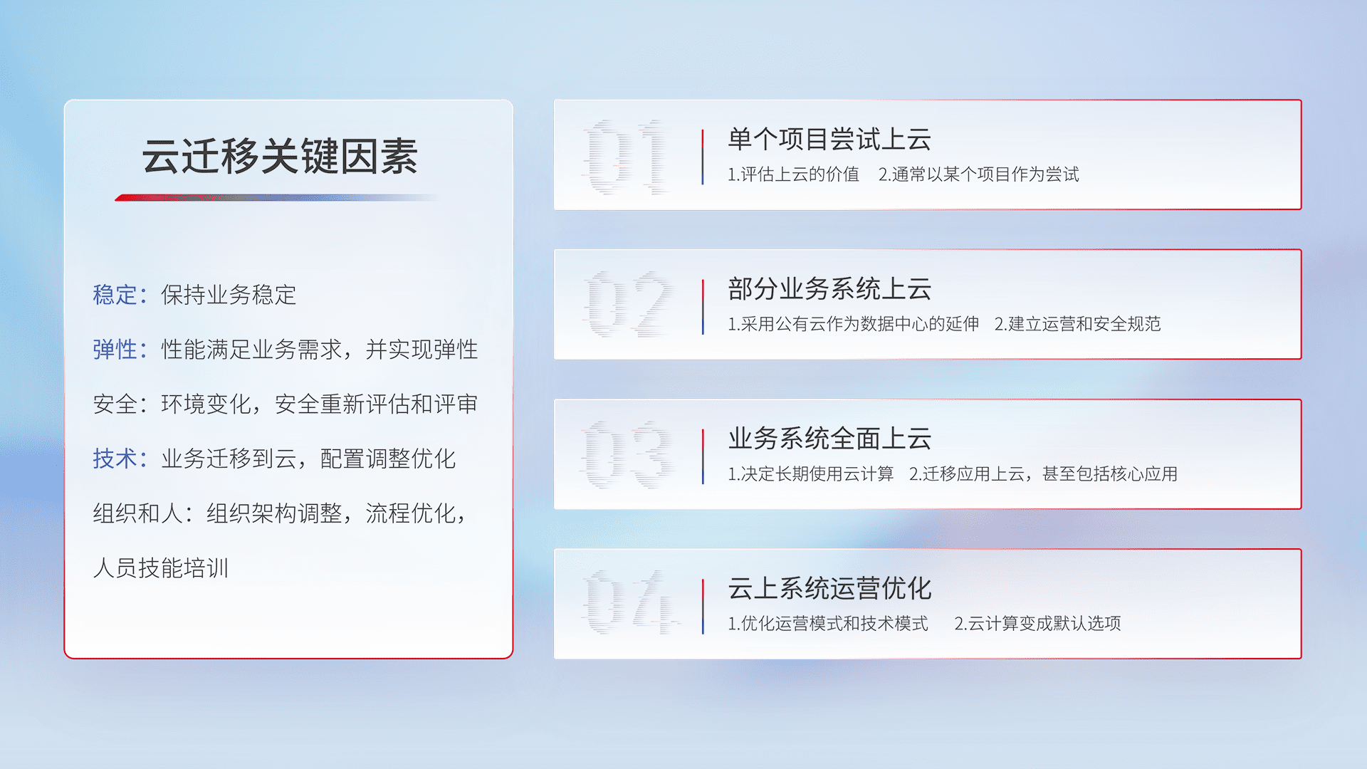 结合实际业务,,,,从规划设计、、、云平台选型、、、云原生改造、、、、数据迁移、、、、集成交付,,,,迁移全过程为客户识别最佳上云路径,,,做好风险识别管理,,,设计网络架构、、身份权限、、、安全审计合规、、、操作审计、、、、日志审计、、监控告警策略、、、多站点容灾设计等,,对云上基础设施进行整体规划,,,提升IT治理水平,,,,以满足弹性、、、高可用、、高性能的需求。。